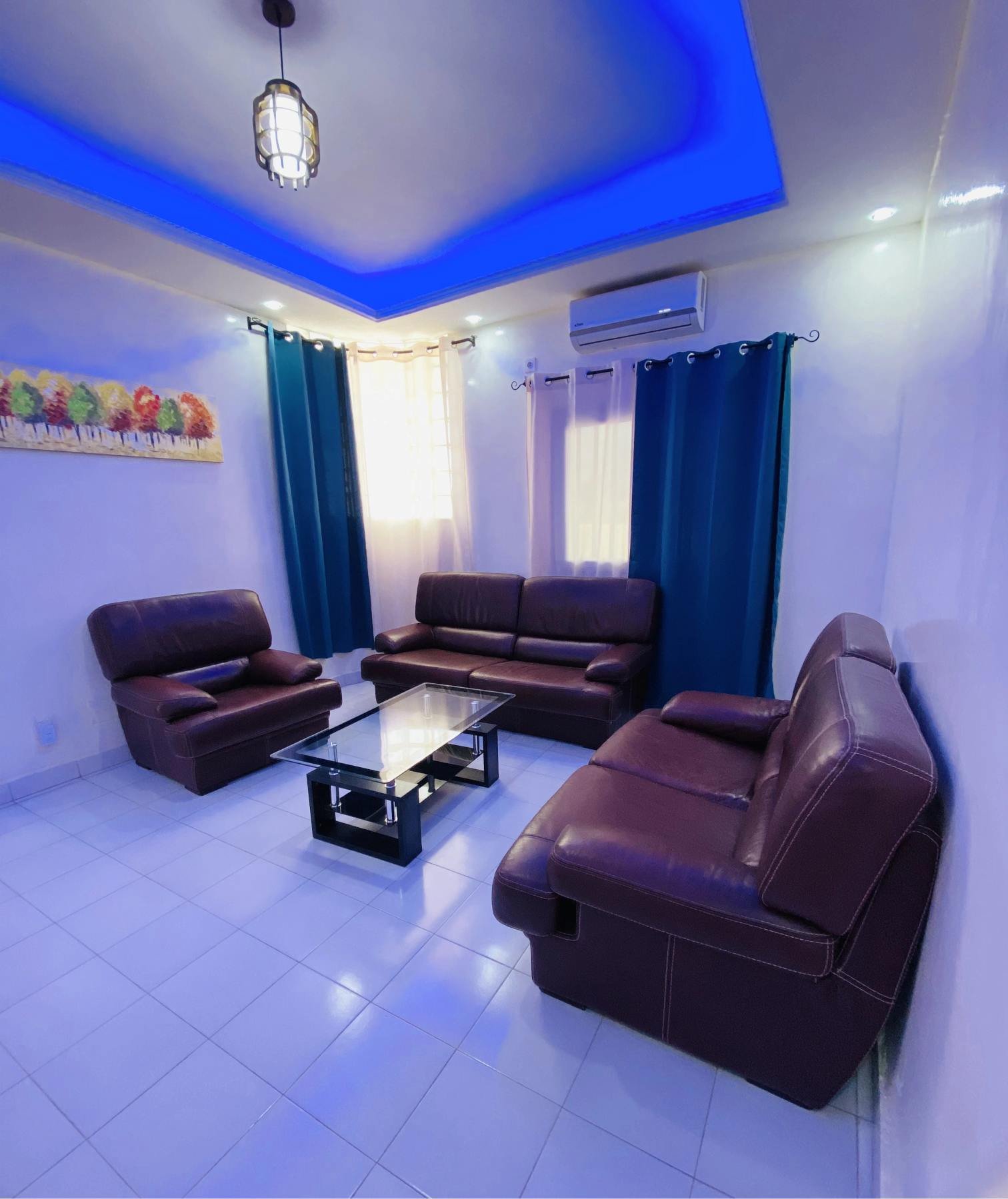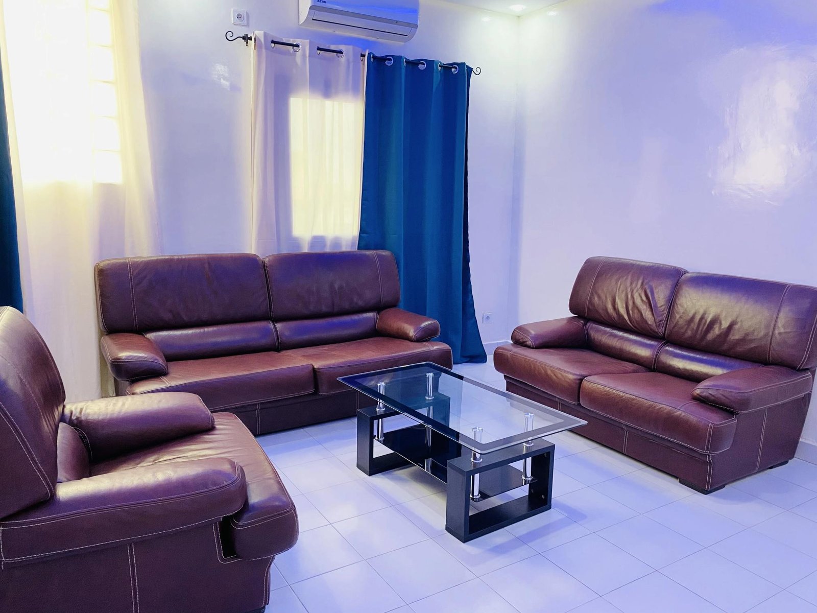 Salon spacieux et lumineux avec canapé confortable et TV 4K connectée, idéal pour se détendre après une journée de tourisme ou de travail à Dakar.