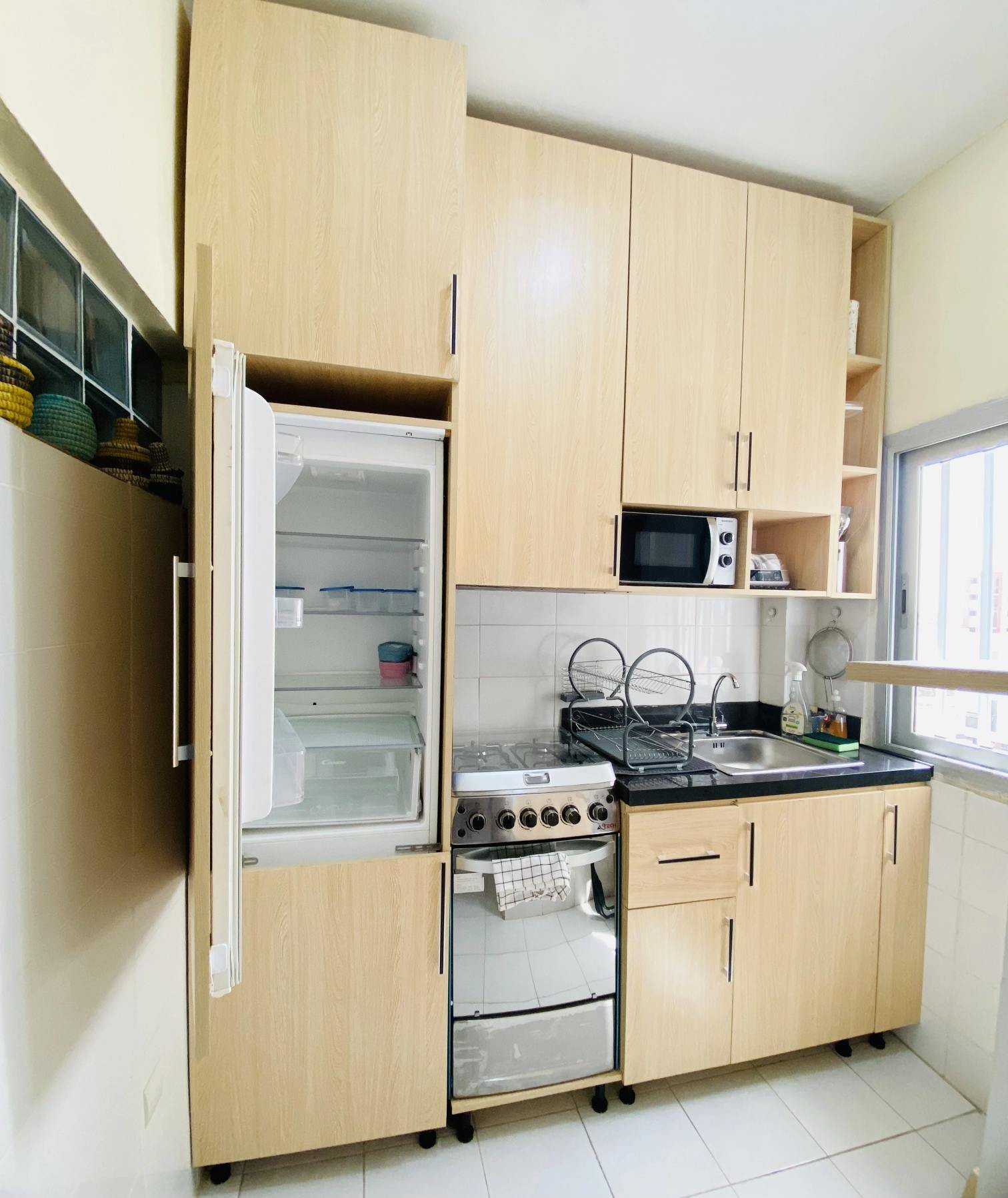 Cuisine entièrement équipée avec réfrigérateur, four, micro-ondes et ustensiles, pratique pour préparer vos repas.